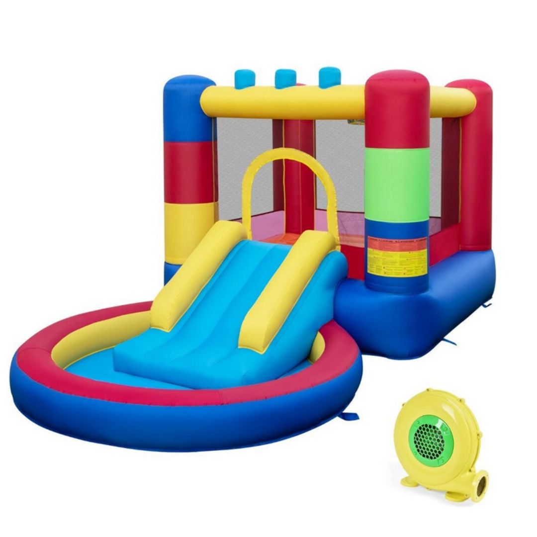 Този надуваем детски замък ще предостави на вашето дете незабравими мигове от неговото детство. Със своите функции – гладка пързалка, голяма зона за скачане, баскетболен кош и кръгъл басейн с топки – замъкът насърчава спортния интерес на децата и тяхното развитие. Освен това, защитните мрежести стени и повдигнатите рампи гарантират безопасност по време на игра. Надуваемият замък се надува автоматично за няколко минути с включения вентилатор. Просто го включете и фиксирайте на земята с помощта на колчетата. Когато не се използва, лесно можете да го приберете в транспортната чанта за бъдещи игри.