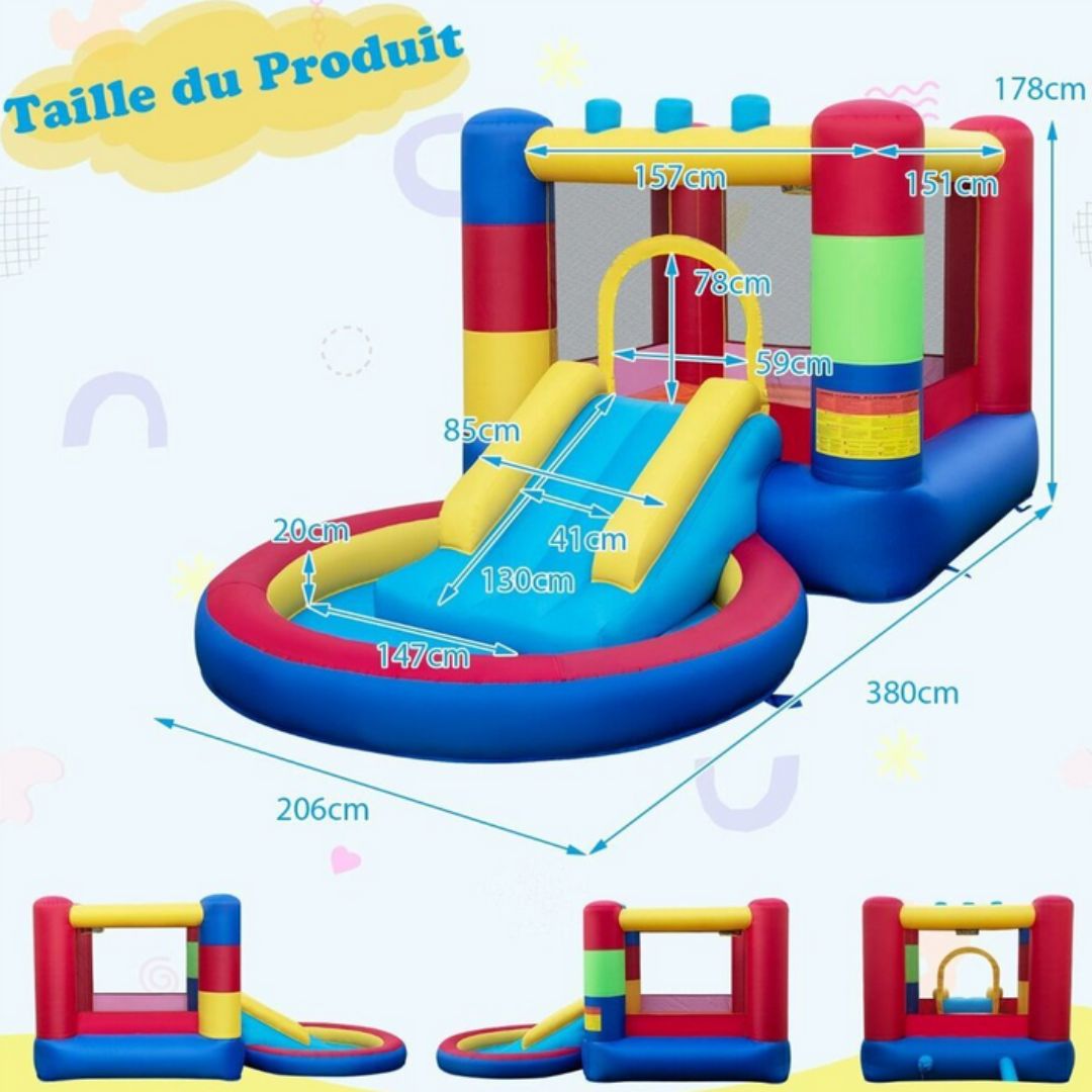 Екипиран с вентилатор с мощност 480W, замъкът се надува за няколко минути. След като играта приключи, замъкът може да се съхранява в транспортната чанта, за да бъде готов за следваща употреба.