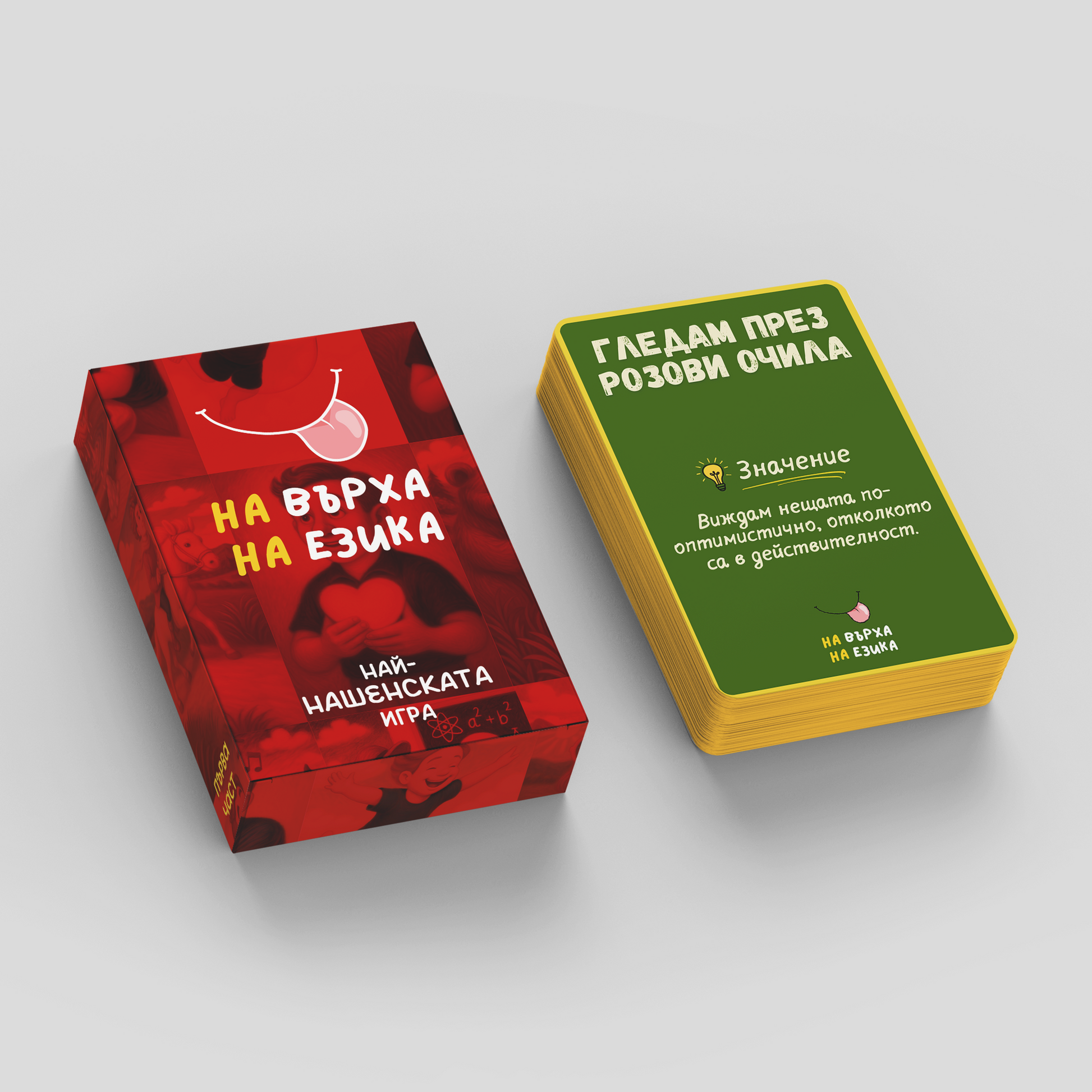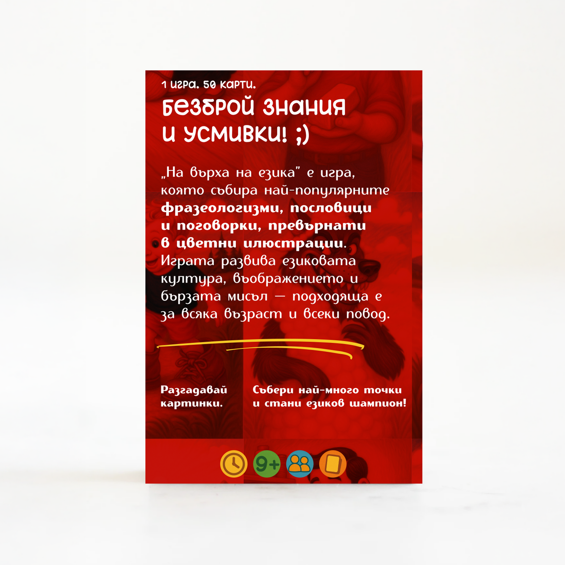 „На върха на езика“ е забавна и образователна игра с карти. Тя отваря вратата към пъстрия свят на българските фразеологизми, поговорки и пословици.