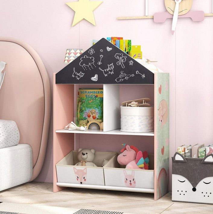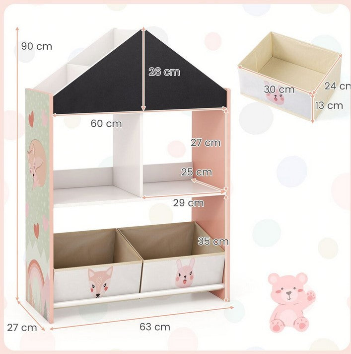 Този детски рафт е перфектното решение за организиране на играчки, книги и други вещи на вашето дете. Разполага с 4 горни отделения, 2 открити рафта и 2 подвижни и сгъваеми текстилни чекмеджета, осигуряващи достатъчно място за съхранение. С височина от 90 см, подходяща за деца, малките лесно достигат до своите вещи. Освен това, рафтът има черна и бяла дъска, които насърчават творчеството и въображението на децата.