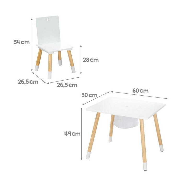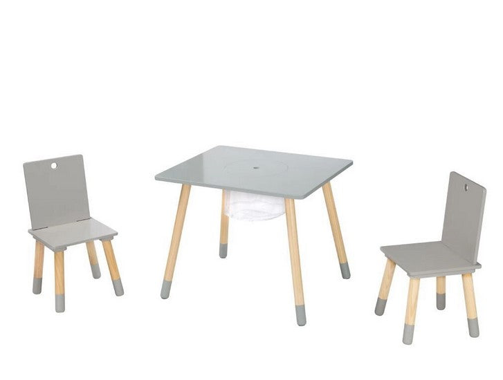 Комплекта се състои от елегантна детска масичка с вградена мрежа удобна за съхранение на играчки,конструктори,книги и много други вещи на малките изследователи,заедно с две удобни столчета.