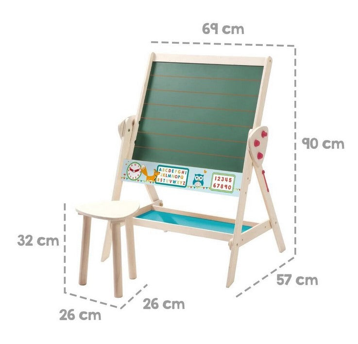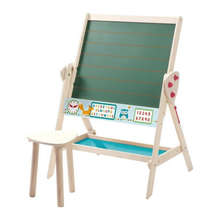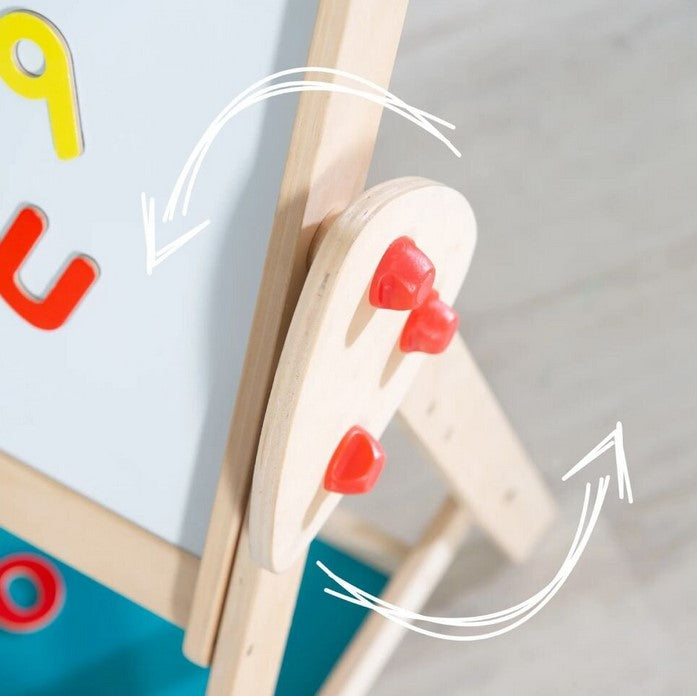Двустранната дъска с магнитна страна предлага достатъчно пространство за креативен дизайн. За игриво учене дъската има часовник с движещи се стрелки и отпечатана азбука.