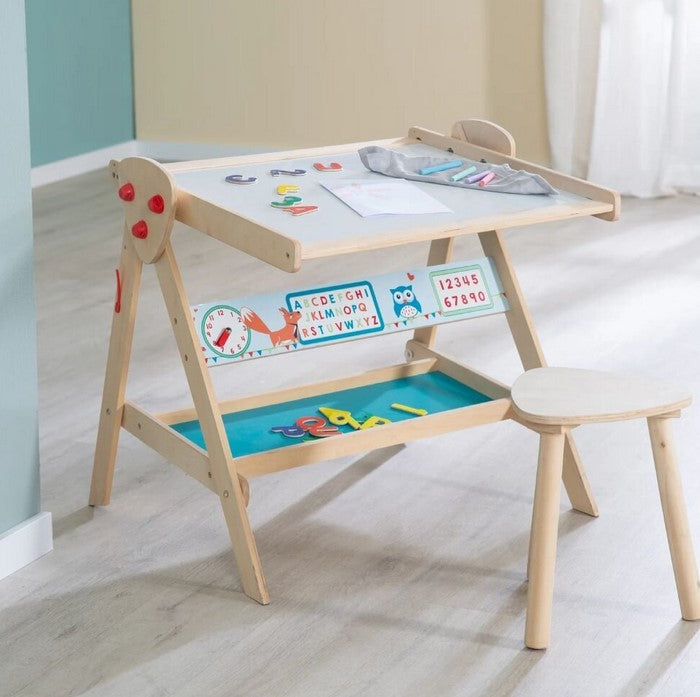 Практичната комбинация от училищна дъска и детско бюро заедно с удобно столче, кани вашия малък ученик да се научи да чете, пише и рисува по-най забавния начин.