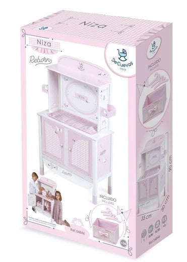 Стилният дървен шкаф NIZA е перфектен за малки любители на ролевите игри и грижата за кукли. Изработен от висококачествено дърво със ситопечат, той съчетава функционалност и красив дизайн, напомнящ истински бебешки мебели.