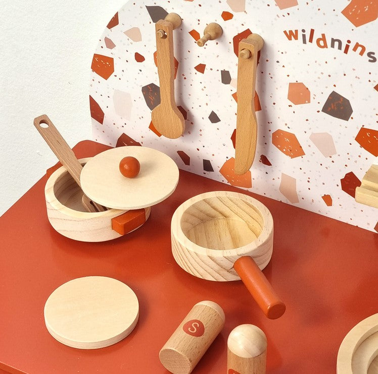 В комплекта ще откриете всичко необходимо: тиган, тенджера с капак, прибори (лъжица, нож и вилица), солничка, пиперница и дори пилешко за рязане. Малките готвачи могат да подредят аксесоарите в шкафчето с вратичка, а престилката да закачат удобно на страничната дръжка.