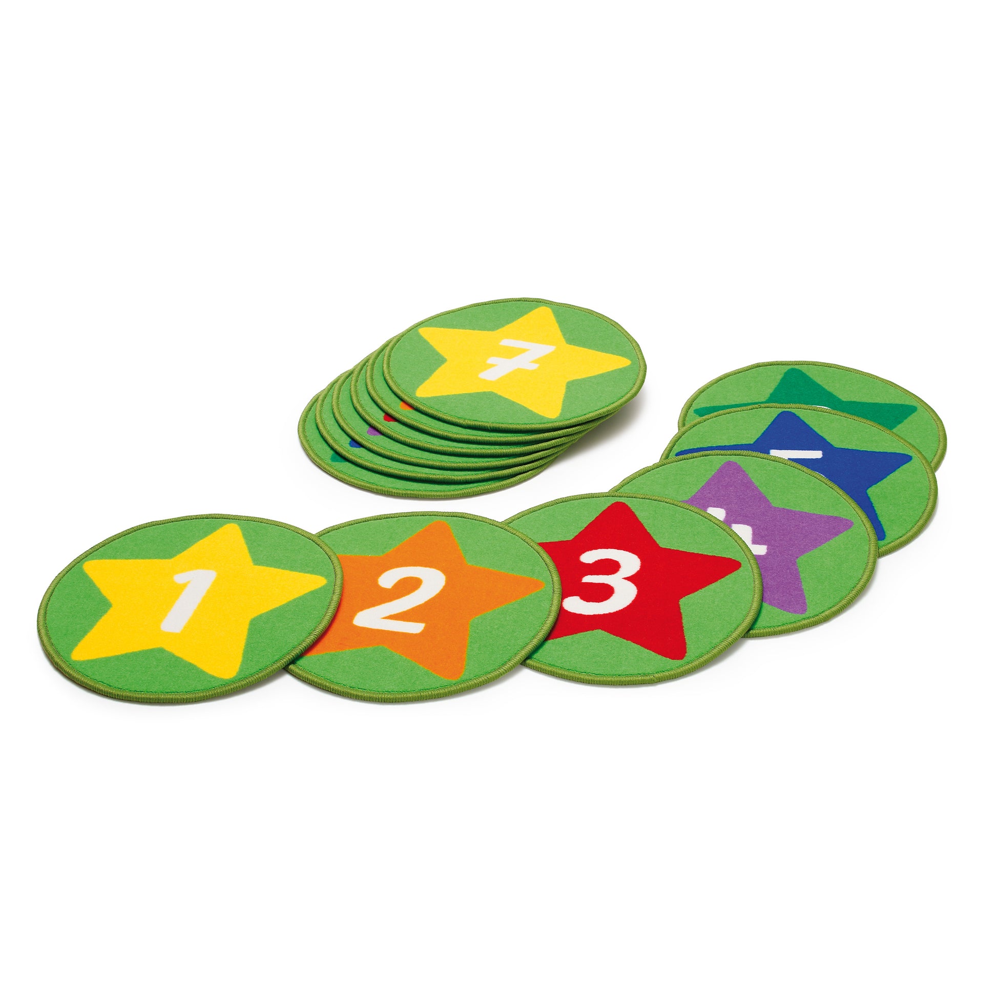 Числата от 1 до 12 са идеални за научаване на часовника и месеците. Простата практика за овладяване на реда на фигурите осигурява много забавление сред младежите, особено в разширена група. Цифровите килими са идеално допълнение към големите кръгли групови килими, напр. Circelino 300 (арт. № 51150). Като всички килими Erzi за детска стая, тези малки килими за сядане и учене са издръжливи. Допълнителното сплъстяване от долната страна предотвратява навлизането на студ.