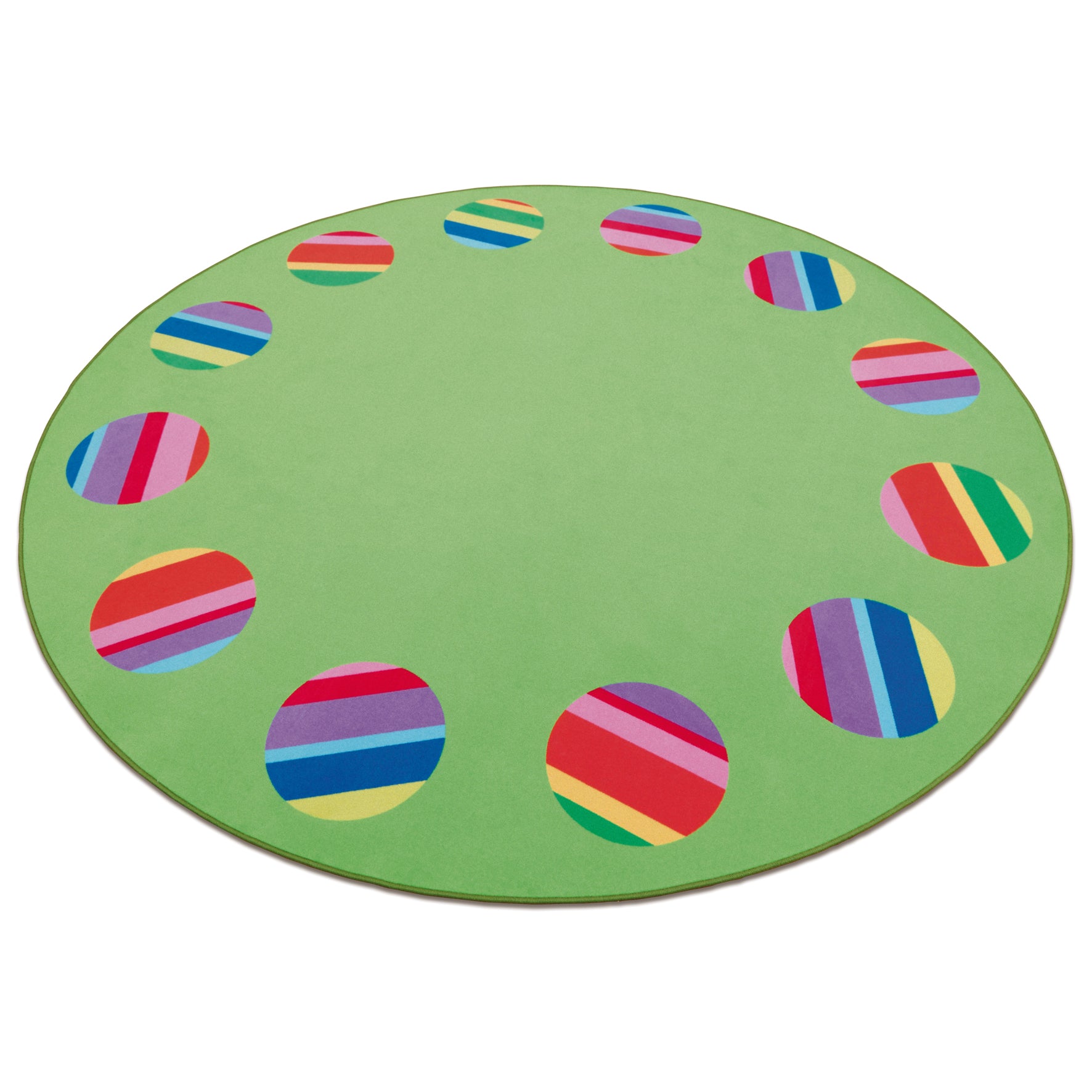 Голям цветен килим за провеждане на игри в кръг. Тук можете да намерите място за до 12 деца във формата на цветен раиран кръг. По този начин всеки ден може да започне щастливо.