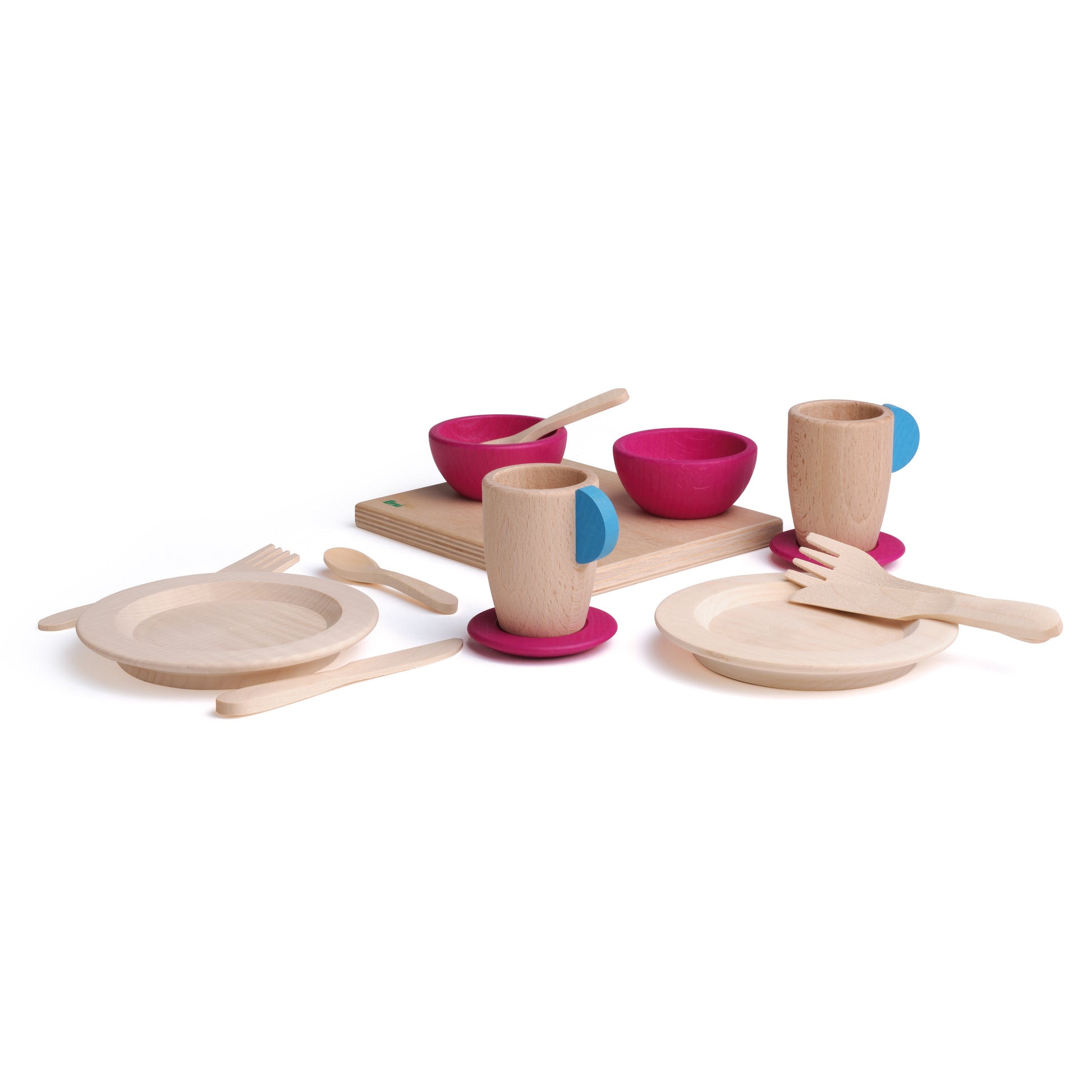 Комплектът съдържа: 2 чинии, 1 дъска за рязане, 2 малки ключа, 2 чаши с чинийки, 2 комплекта прибори (нож, вилица, чаена лъжичка)