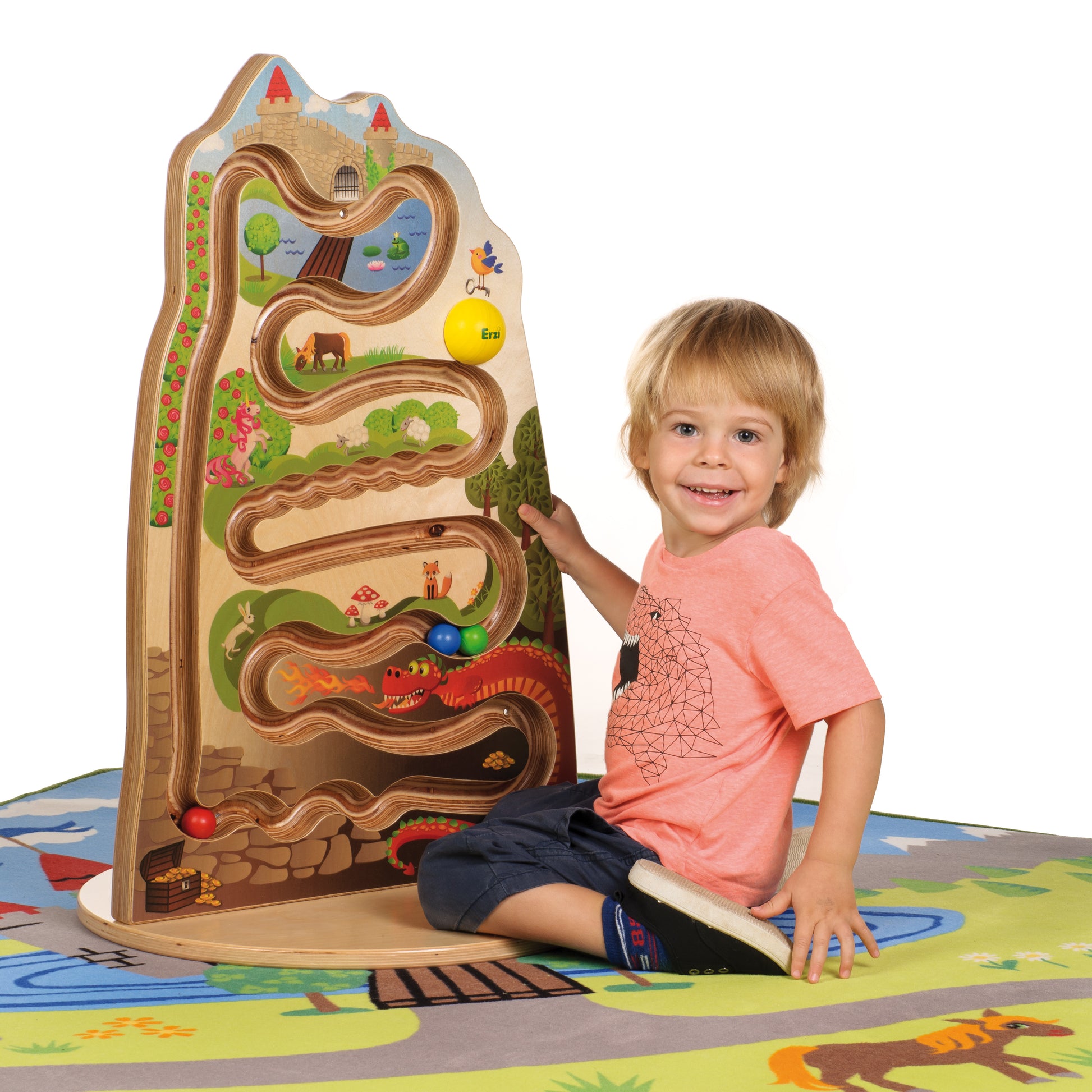 Прикрепени към стената на зона за групова игра, чакалня, фоайе или където и да е другаде, мраморните пътеки Erzi винаги привличат окото: три весели дървени мрамора изглежда чакат нетърпеливо да се впуснат в обиколка на омагьосана гора. По пътя си покрай замъци и дракони те преживяват всякакви приключения. Мраморите винаги остават на път. Мраморната пътека може да се постави свободно из стаята с помощта на основната плоча Erzi (арт. № 51004).
