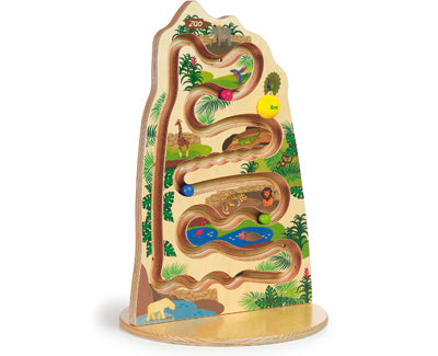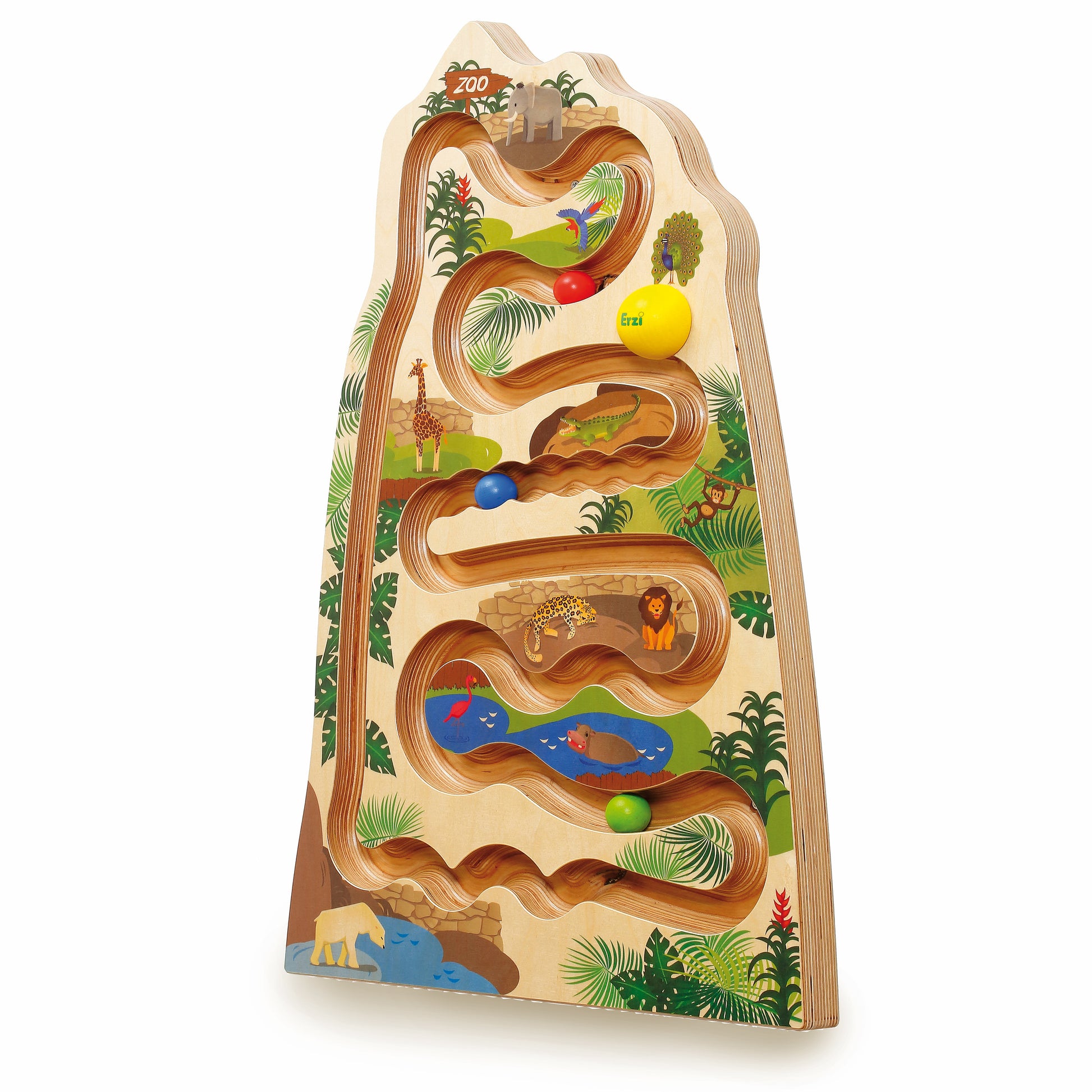 Винаги привличащи вниманието, състезателните писти с топка Erzi могат да бъдат монтирани на стена в зона за групова дейност, в чакалня или фоайе. Три цветни дървени топки чакат да се впуснат в обиколка на зоопарка. Преминавайки покрай диви животни и гъсти храсти, те преживяват много приключения. Топките винаги остават на пътя. Основната плоча Erzi (арт. № 51004) позволява свободното монтиране на пистата с топка във всяка стая.