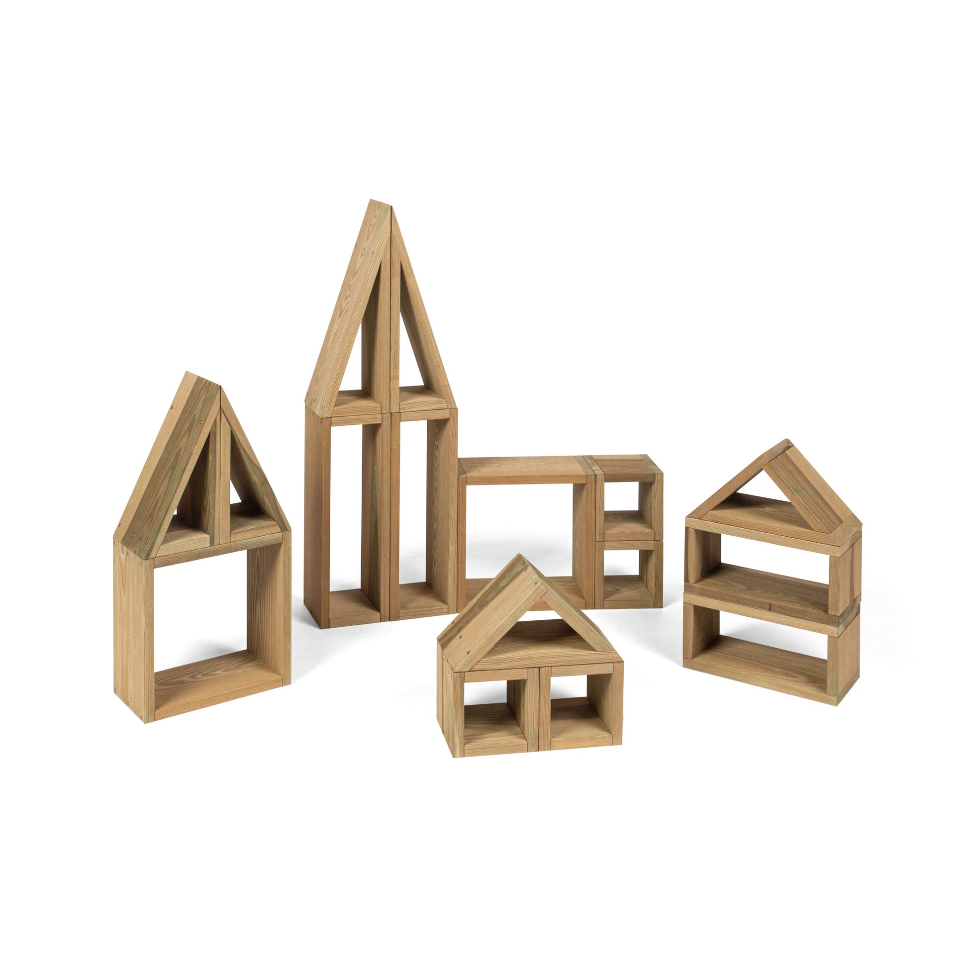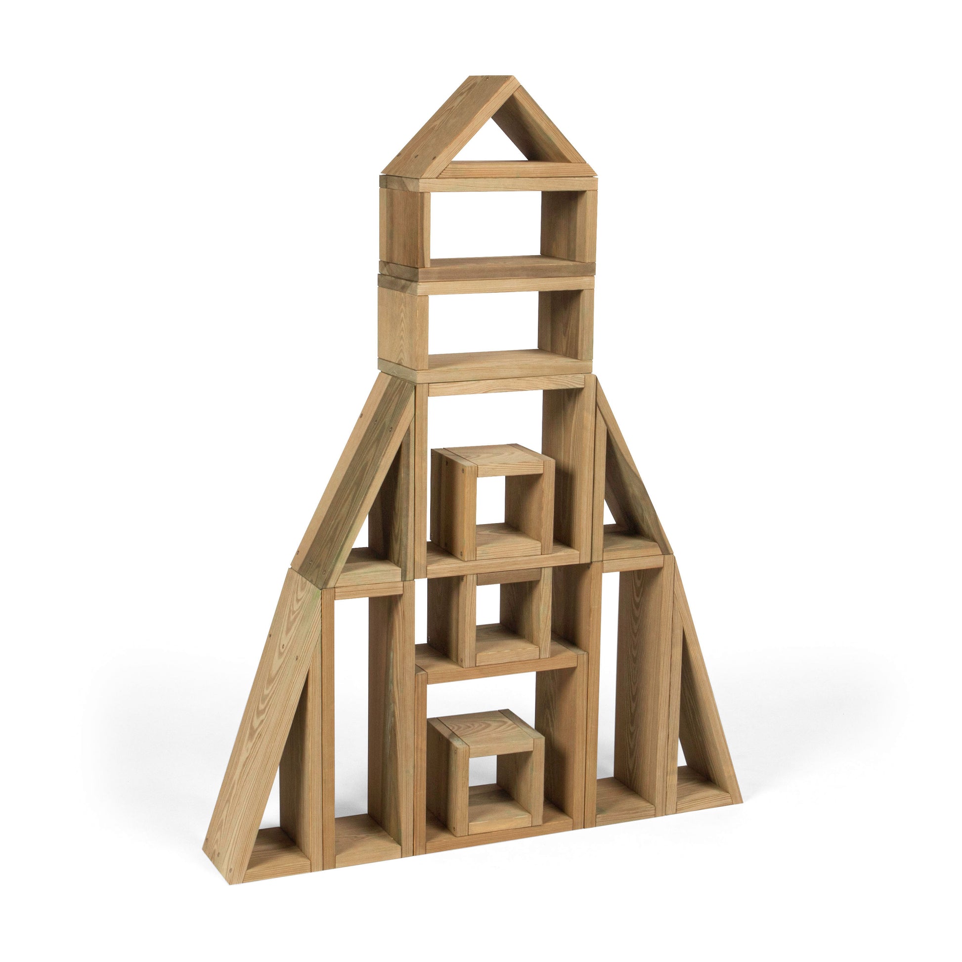 С нашите големи строителни блокове за открито, изработени от устойчиво на атмосферни влияния дърво, децата могат да дадат воля на своята креативност и да създават впечатляващи структури.