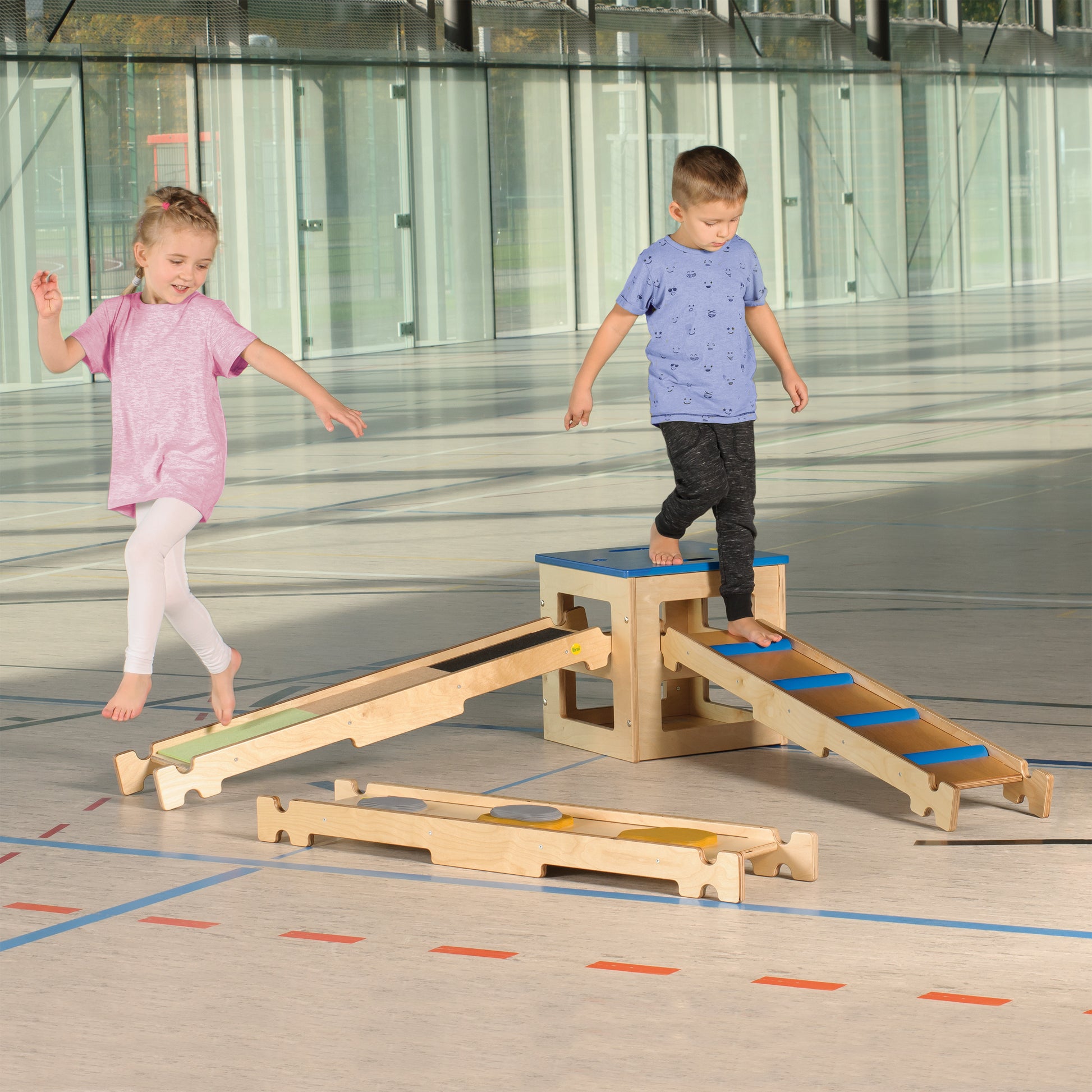 Кратки маршрути през хълм и долина! Този комплект за балансиране също е универсален вариант за упражнения за по-малки стаи. Стълбата за пиле се качва диагонално до спортната кутия и се спуска обратно по разнообразни пътеки с камъни и различни структурирани материали. Независимо дали пълзите, боси или се плъзгате по дъното си: пътеките могат да бъдат изследвани по различни начини и комбинирани отново и отново. Това означава, че никога не става скучно и винаги можете гъвкаво да регулирате трудността, за да отговаря на способностите на вашите деца. Sportbox S е малък универсален автомобил. Независимо дали като табуретка, място за съхранение или спортно оборудване: винаги изглежда добре. 2 отвора от всяка страна ви позволяват да окачите до 4 балансиращи дъски Erzi едновременно. Синият капак също е ролкова дъска с тихи и удобни за пода въртящи се колела. Пилешката стълба S е просто част от зона за упражнения; тя насърчава координацията дясно-ляво. Малките стъпала правят катеренето нагоре и надолу детска игра. Вашите крака са предизвикани и тренирани на полевата дъска за балансиране на камъни. Ръбовете и повърхностите на различни по височина камъни се опипват с крака. Цветната комбинация от материали против подхлъзване, корк и килим стимулира сетивната система. Това прави усещането за разлики специално изживяване. Как ще комбинирате тези елементи зависи от вас. Имате всички възможности! Независимо дали във формата на звезда, в кръг, плосък на земята, на ниска височина или като наклонена равнина: изживяването при балансиране тук е многостранно, забавно и насърчава физически умения като бягане надясно и наляво, координация и баланс. Между другото: Можете също така да получите всички елементи от този комплект поотделно от нас.