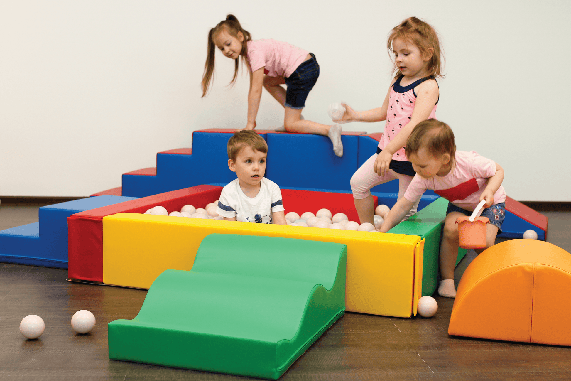 Комплектът съдържа: Сет от комплекти 12 бр. - стълба с пързалка, тунел, басейн с топки, стълбичка за басейн, баланс модули, вълнообразна стълбичка