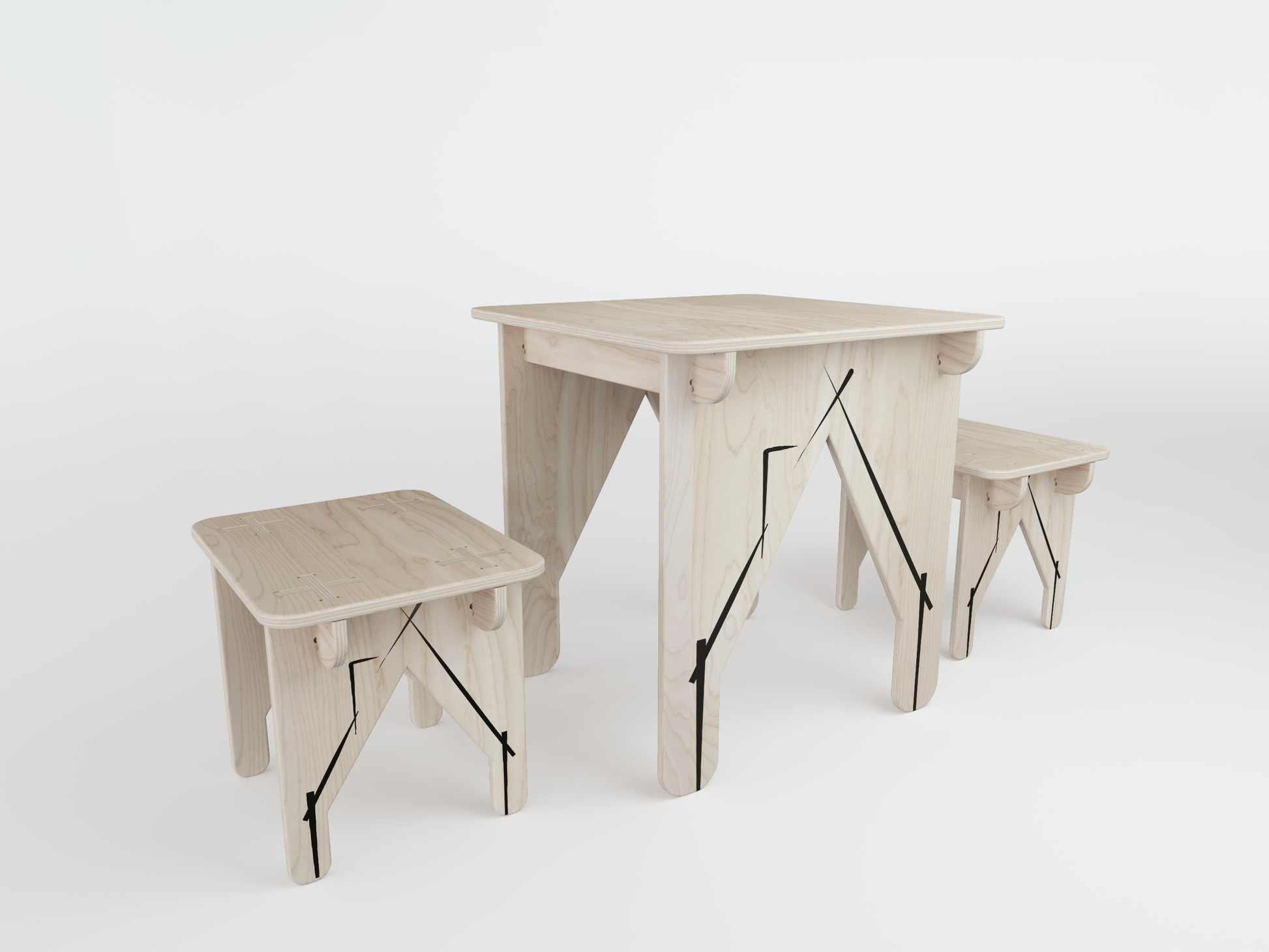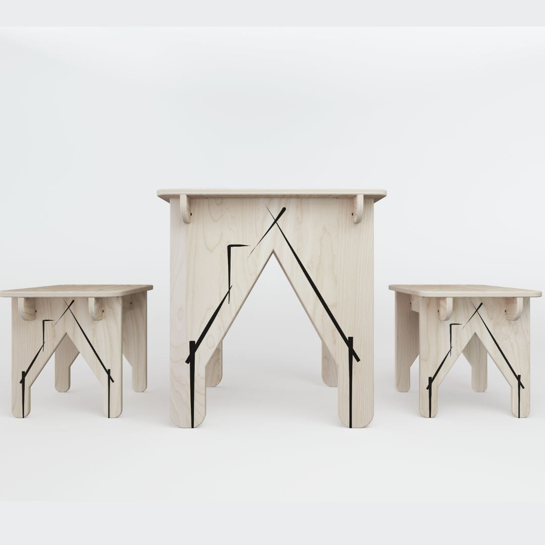 В сет TALO са включени две табуретки и една маса. На страниците на мебелите е направен принт наподобяващ къщички, така че придава въоражение, че самите мебели са къщички. Комплектът е с компактен размер и минималистичен дизайн. Двете столчета се събират под масата и така в детската стая ще остане повече място за игри.
