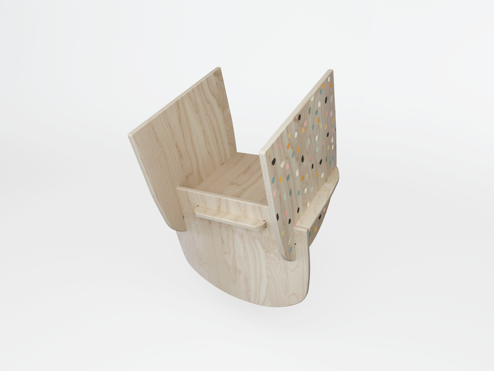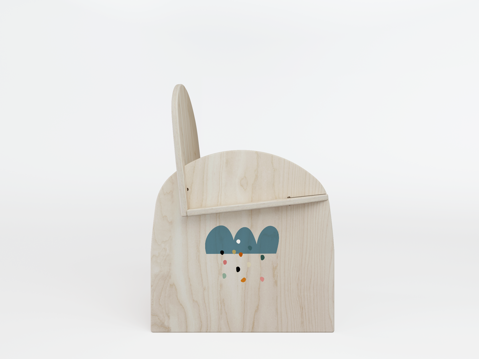 Този модел детски стол, от серията REGNBUE, се характерезира със своите минималистични форми, съчетани с пленителен цветен дизайн. С печат от двете страници на столчето, то мигновенно ще плени детското въображение. От едната страна с шарен магичен дъжд, а от другата облачета.