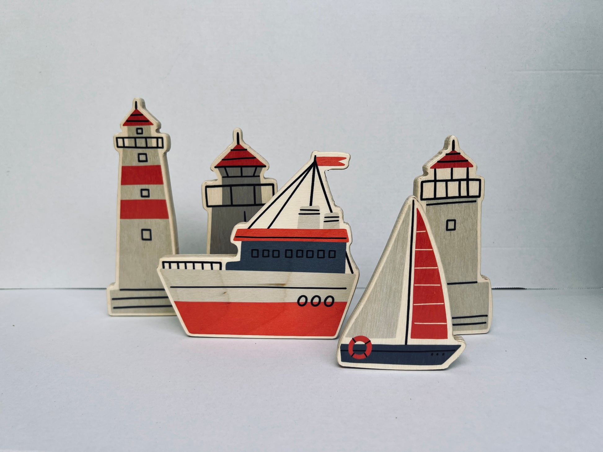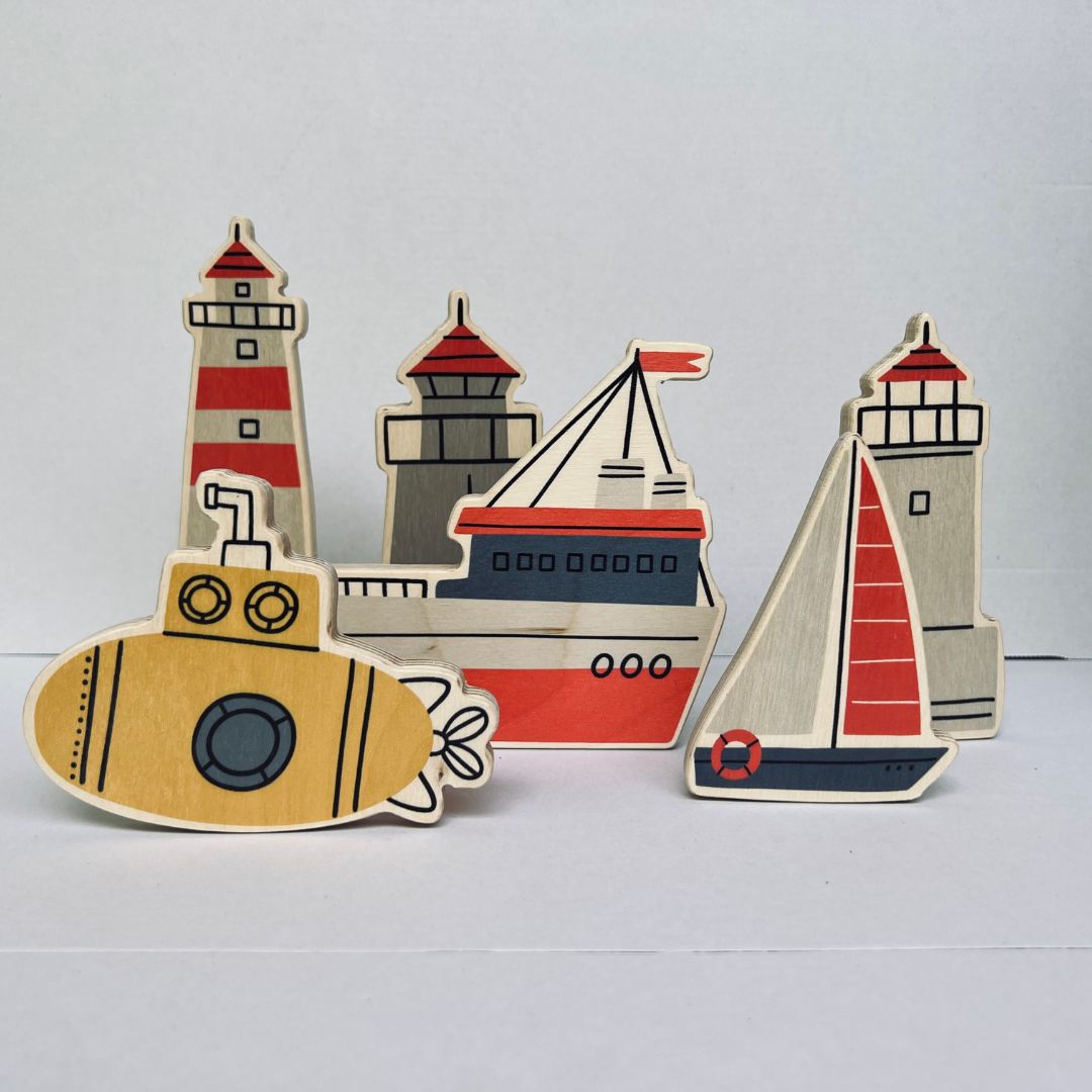 Морско приключение от 6 различни фигурки, направени от брезов шперплат. Невероятен сет, които стимулират творчеството и въображението на Вашето дете.