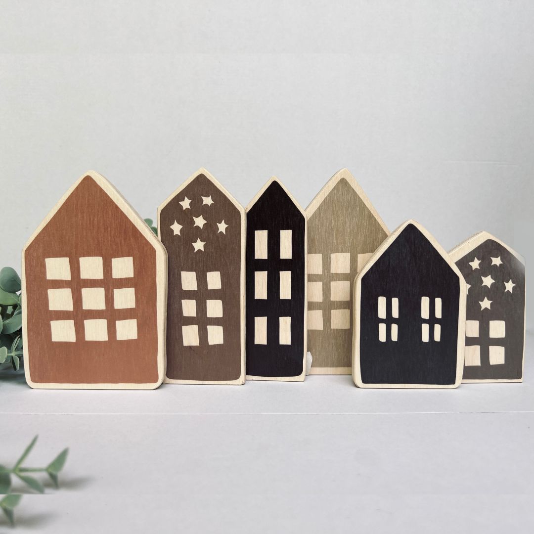 Сет от 6 различни къщички, направени от брезов шперплат. Невероятен комплект, които стимулират творчеството и въображението на вашето дете. Фигурките спомагат за изграждането на ранни умения, за разграничаване на форма, цвят и размер. Те са много полезни за развиване на координацията око-ръка, фината моторика и стимулиране на детското въображение. Също така, те укрепват усещането на бебетата за задържане, хващане и възприятие.