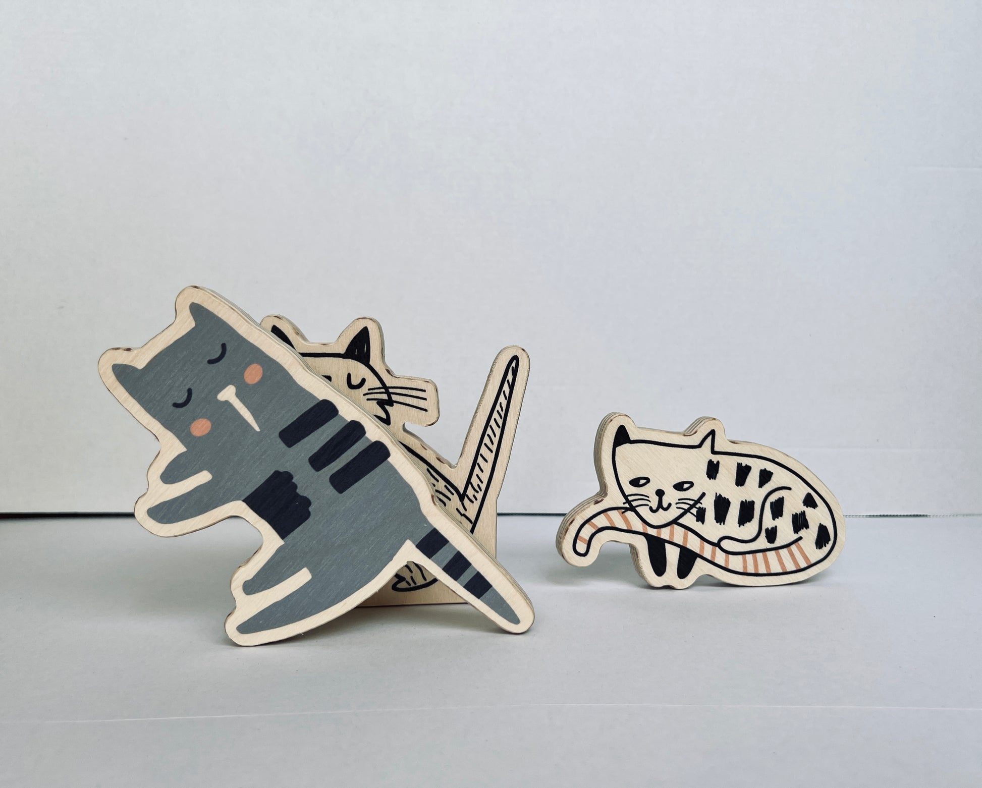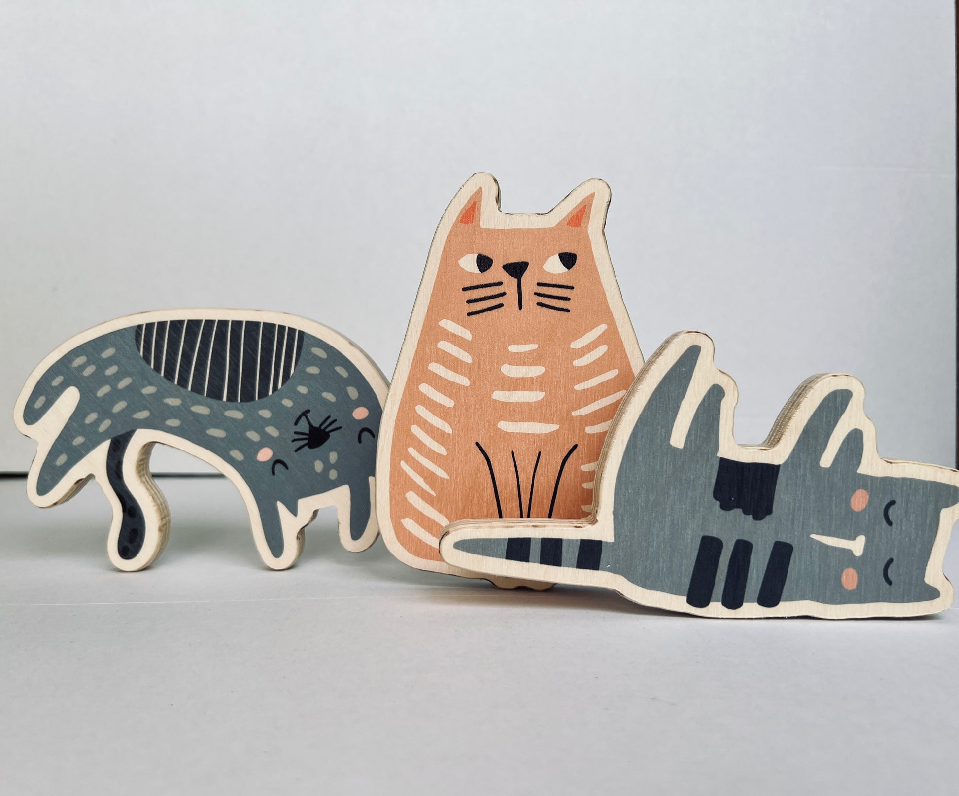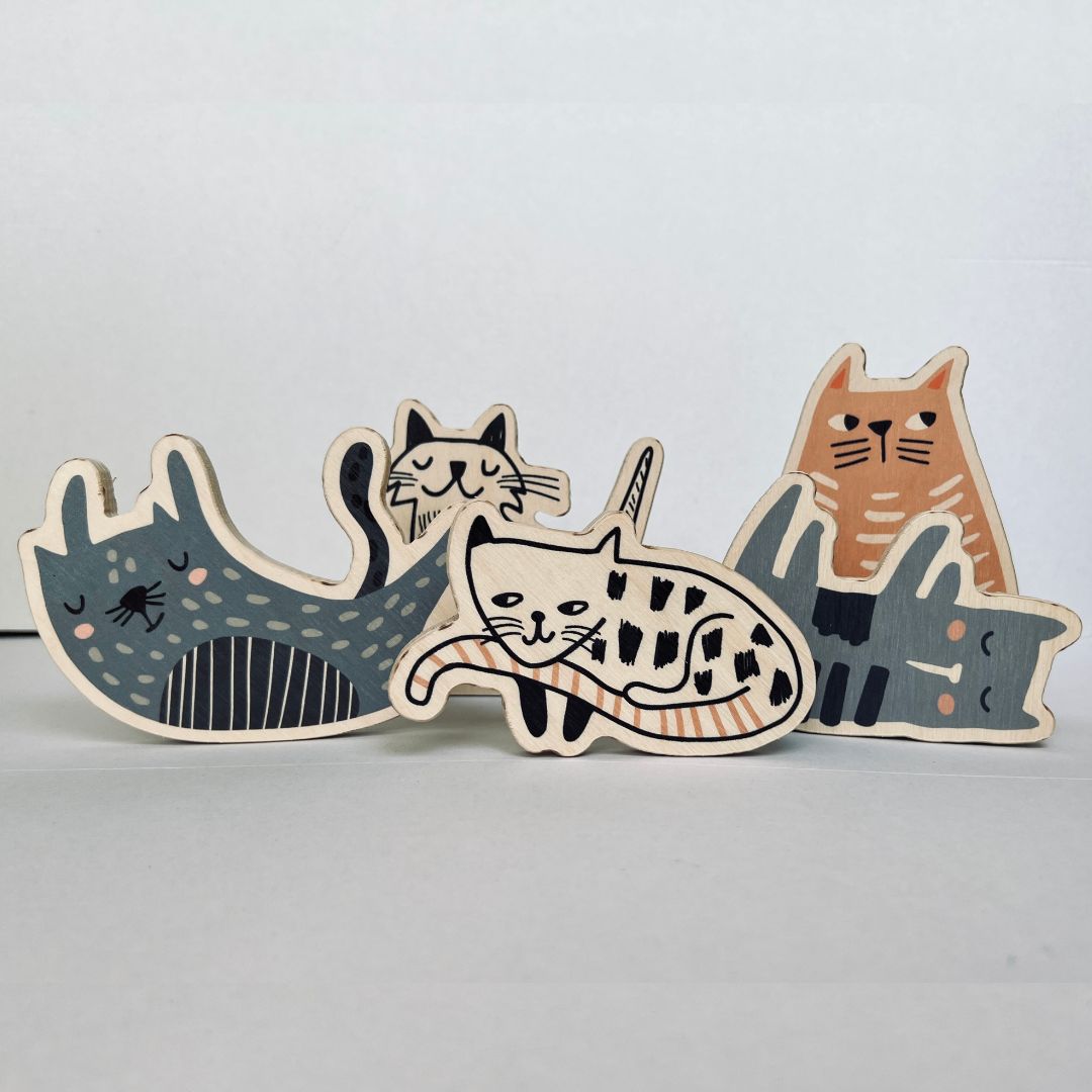 Сет от 5 различни фигурки изпълващи пространството с котешка атмосфера, направени от брезов шперплат. Невероятен сет, които стимулират творчеството и въображението на вашето дете. Фигурките спомагат за изграждането на ранни умения, за разграничаване на форма, цвят и размер. Те са много полезни за развиване на координацията око-ръка, фината моторика и стимулиране на детското въображение. Също така, те укрепват усещането на бебетата за задържане, хващане и възприятие.