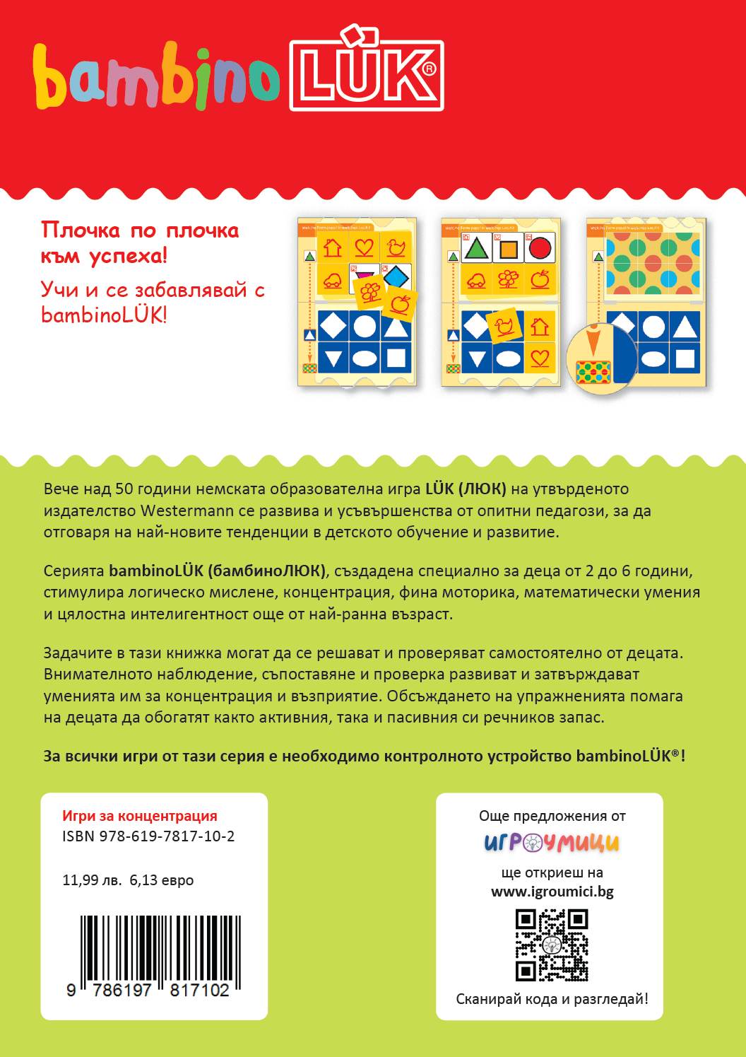Книжката бамбиноЛЮК "Игри за концентрация" предназначена за деца от 3 до 6 години съдържа 11 забавни игри за концентрация, памет и наблюдателност. Задачите в тази книжка тренират по забавен начин способността на децата за възприемане на информация, наблюдателност и концентрация – важни основи за изграждане на логическо и асоциативно мислене: