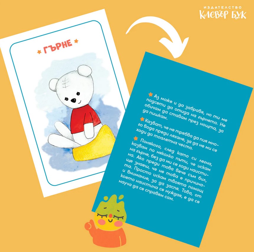 Активните карти, включени в книгата помагат на децата да спазват своята рутина преди и след сън, а на техния гръб има практически съвети за родителите.