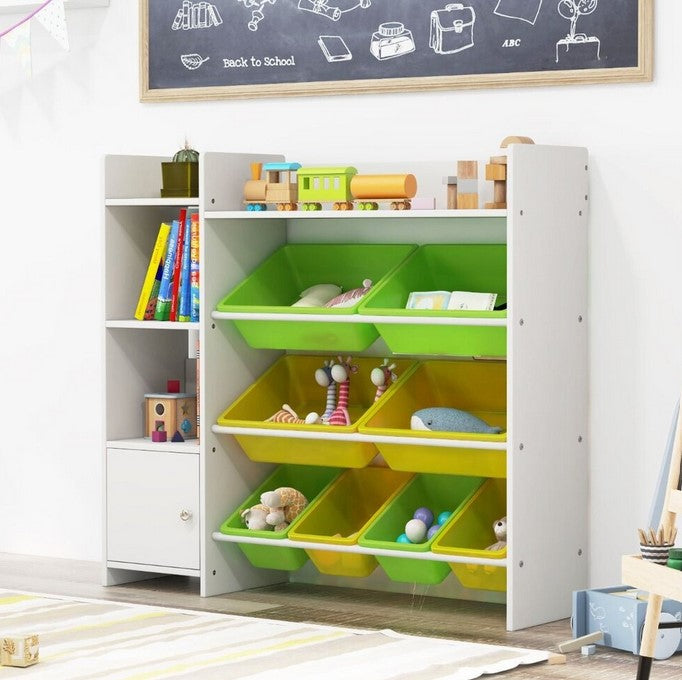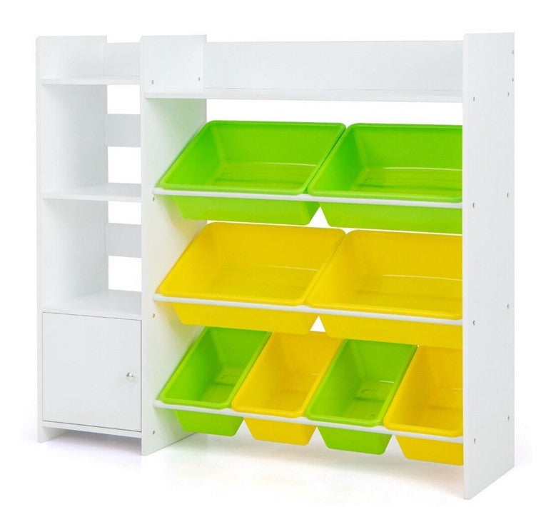 Този шкаф за играчки съчетава рафтове за книги, кошове за играчки и шкаф в едно, което помага да поддържате стаята си чиста и организирана. Той е оборудван с 4 големи и 4 малки пластмасови коша за съхранение на различни видове играчки, книги, канцеларски материали и пъзели. Освен това страничните рафтове и основният шкаф изпълняват изискванията за класифицирано съхранение на вещи за деца. По отношение на здравината този органайзер за съхранение е изработен от здрава рамка и подбрани материали, а устройствата против накланяне го правят по-стабилен при употреба. Контейнерите могат да се отварят и са наклонени, така че децата да могат лесно да съхраняват и достигат вещите си. А заоблените ъгли на контейнера предпазват от наранявания. Затова нашият шкаф за играчки е добро решение за стаята на вашето мъниче.