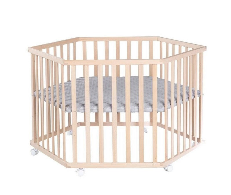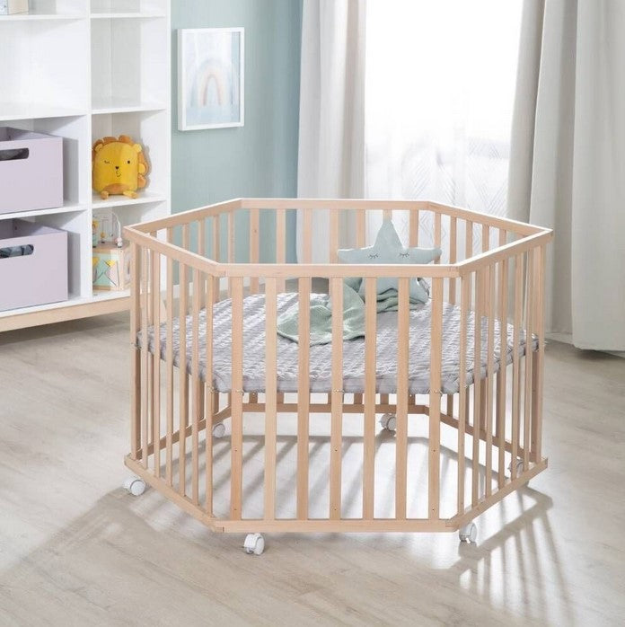 Шестоъгълната кошара roba в стил roba от органичен естествен бук предлага удобна и стабилна повърхност за игра.