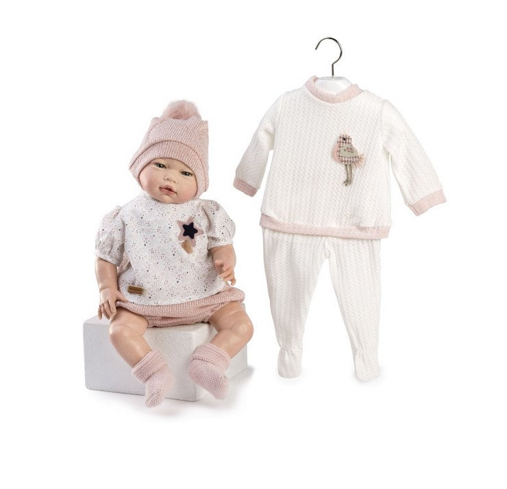 Той има мека и елегантна комбинация: бяла блузка с бебешка яка, розова плетени чорапки и розова шапка. Сладко облекло, което повишава нежността на тази новородена кукла. Притежава ефектът Head Fall за още повече реалистично усещане. Кутията съдържа сертификат за автентичност, акт за раждане, книга за грижи и малък каталог, където можете да видите още много модели.