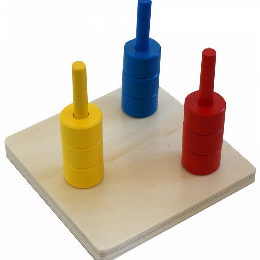 Комплектът съдържа 3 дървени вертикални колчета в различни цветове – жълто, синьо и червено – и по 3 диска за всяко колче в същия цвят.