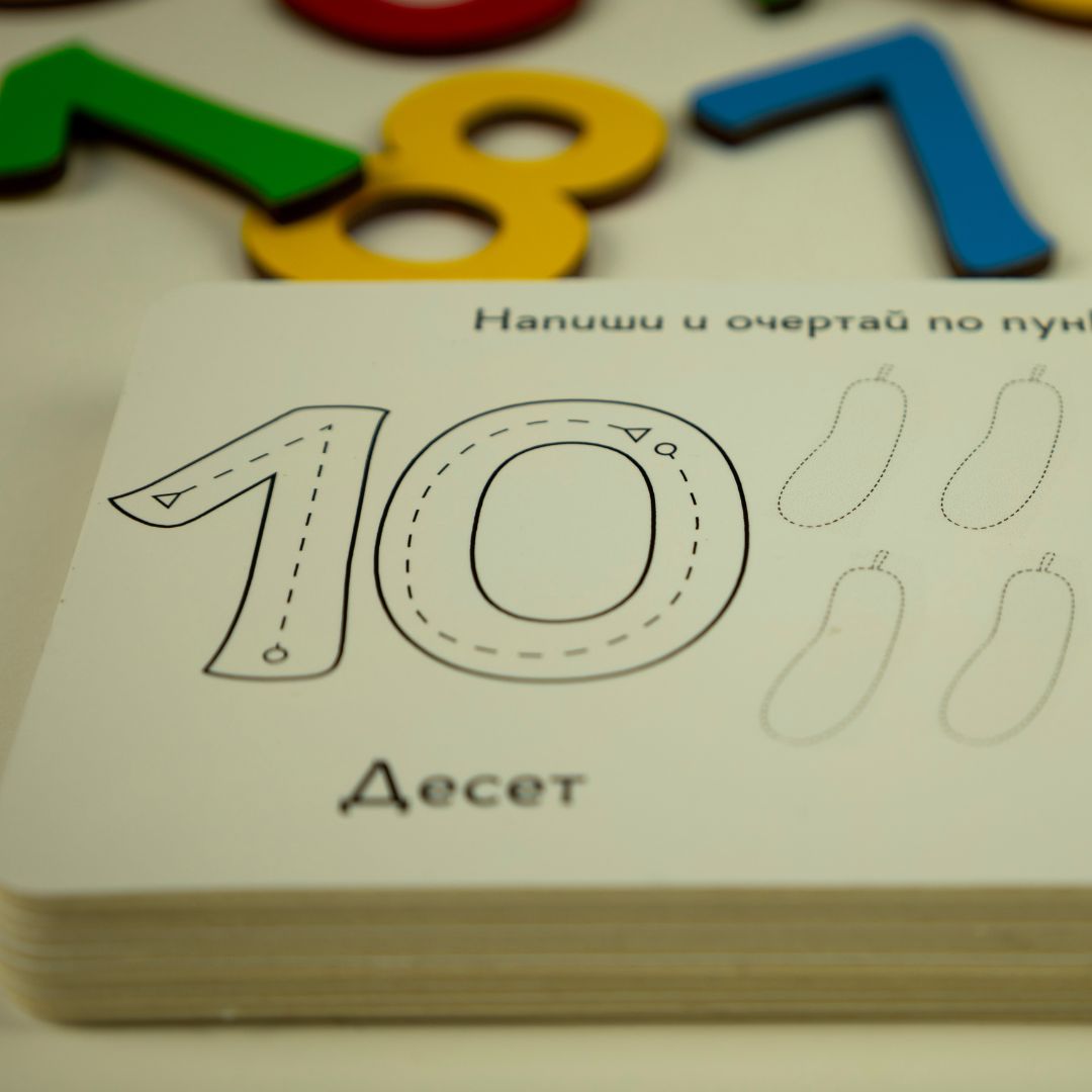 Комплект 10 двустранни образователни карти с цифри, дървени числа и изтриваем маркер.