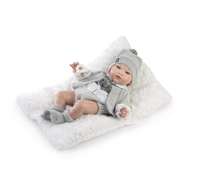 Голяма Кукла Reborn Manu, с бяла риза и сиви дрешки, 42 см