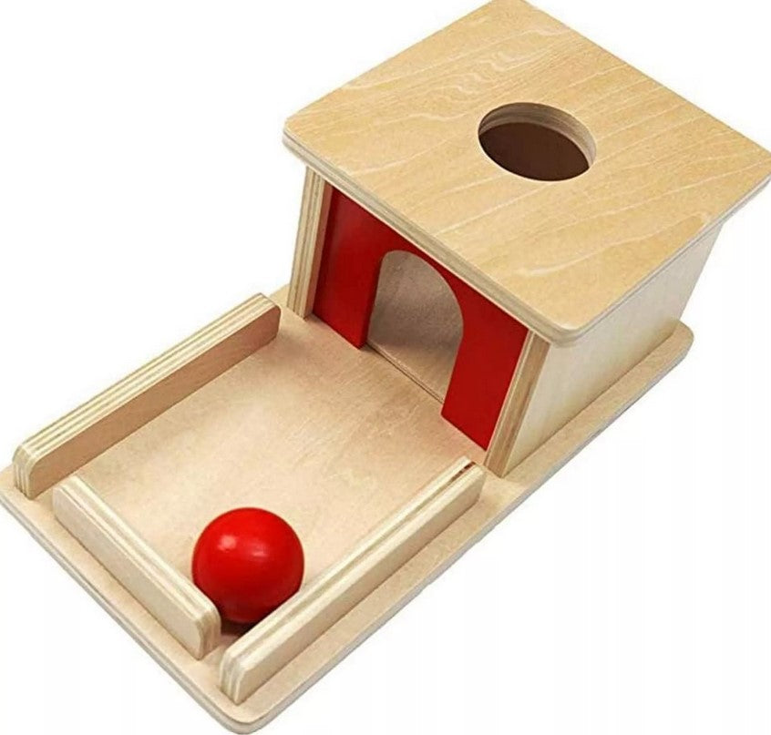Тази красива дървена кутия е създадена, за да развива уменията и логическото мислене на детето. В горната ѝ част има отвор, в който се поставя топката. След като тя бъде пусната, изчезва в кутията и след миг се появява отново върху специалния поднос отпред, откъдето детето може да я вземе.