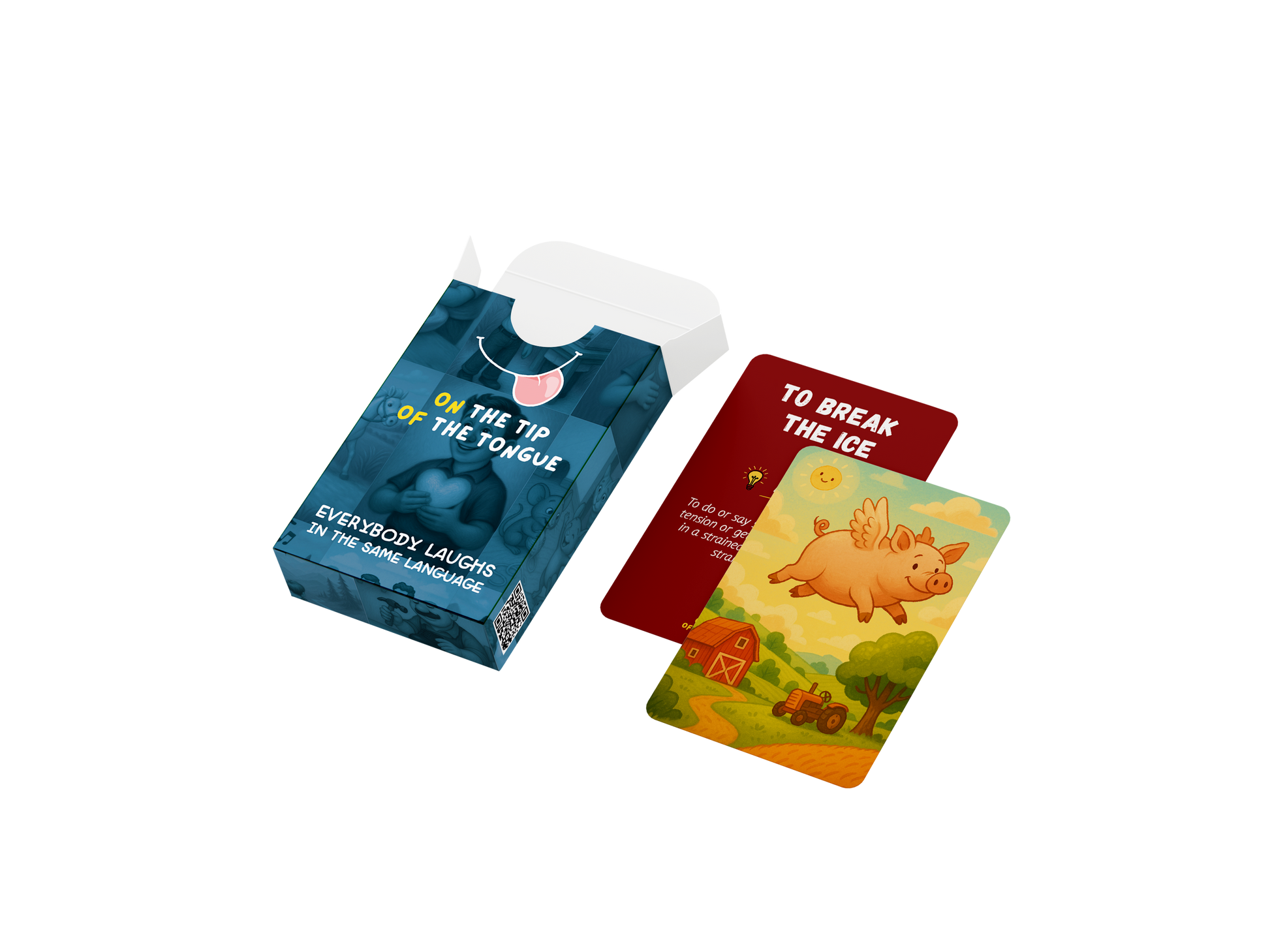 „On the tip of the tongue“ е забавна и образователна игра с карти, която разкрива богатството на английските изрази, идиоми и пословици.