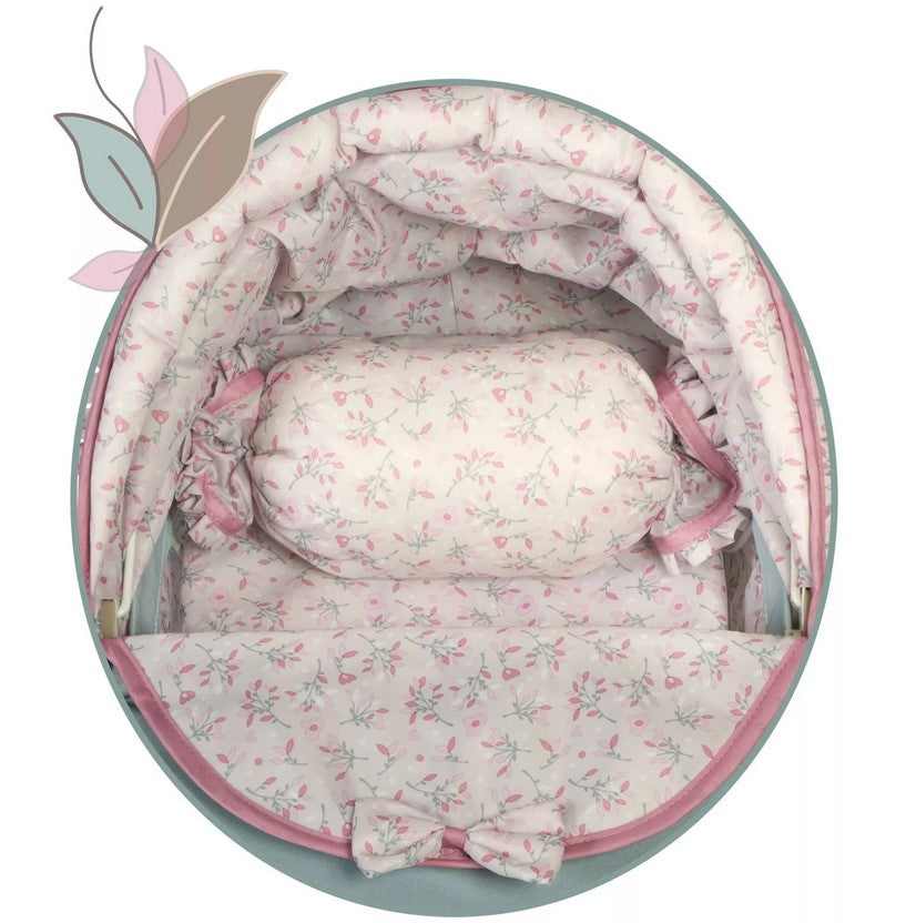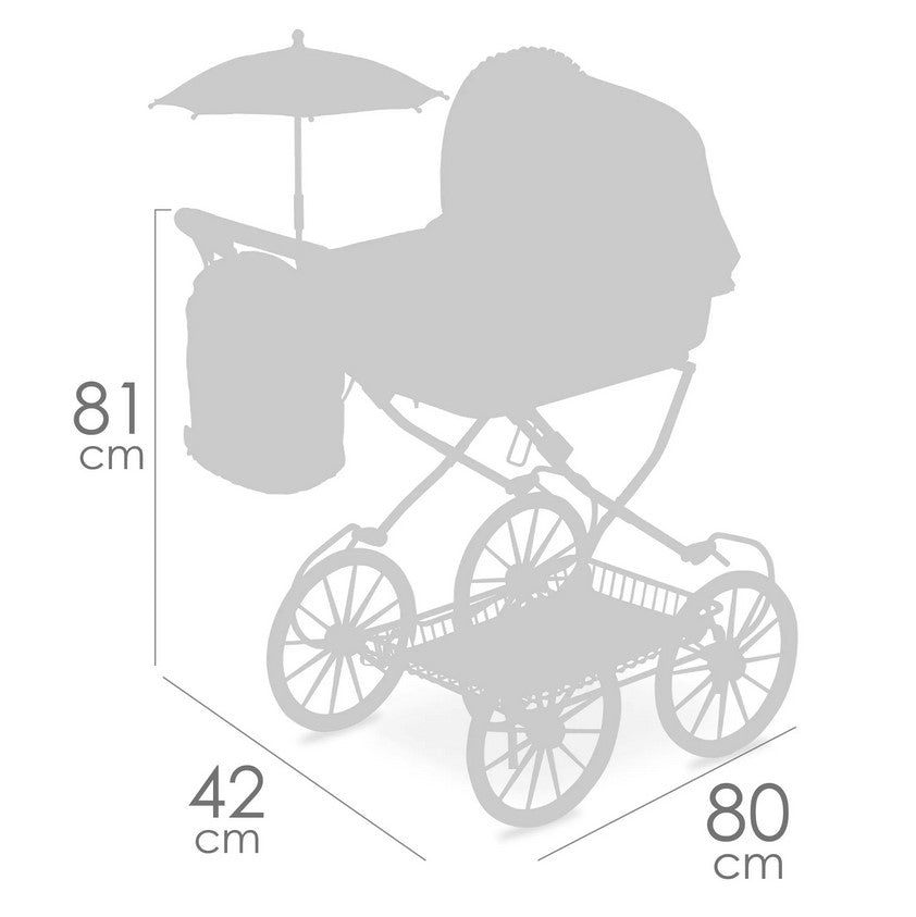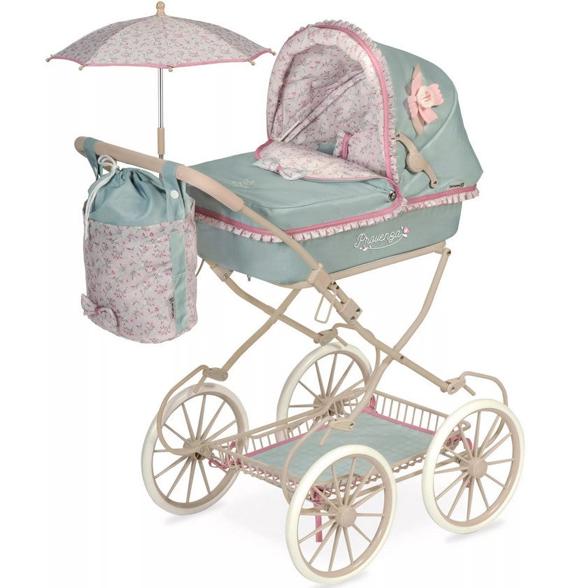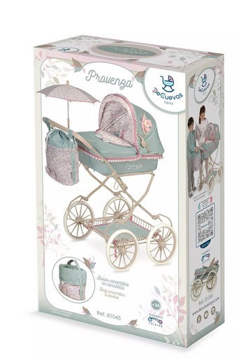 Елегантната количка за кукли Provenza впечатлява със стилен дизайн и внимание към детайла. Тя е сгъваема, лека и практична – с окачване за по-реалистично усещане при игра. Красивият капитониран плат, сенникът с ластици и декоративното цвете придават изисканост и чар.