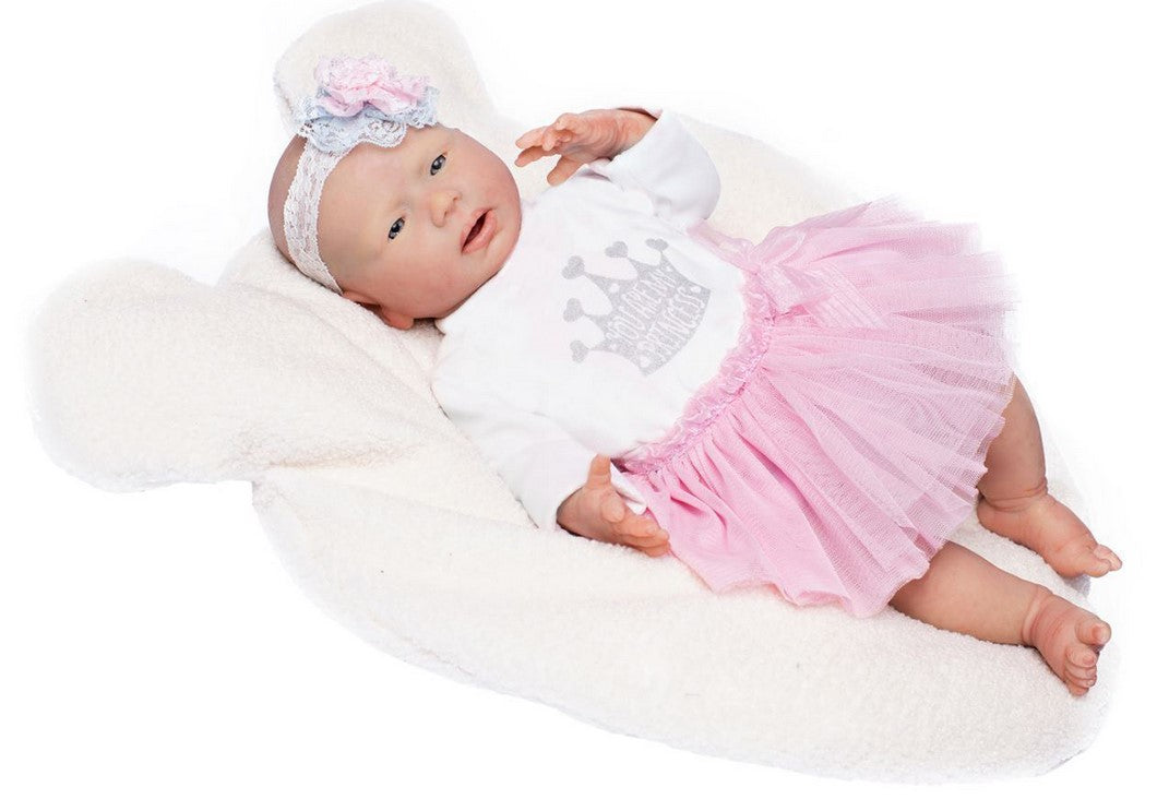 Силиконова кукла Мар. Това е хипер-реалистично бебе, ръчно рисувано и преобразено с детайли като вени, зачервяване, текстура на кожата, език, пъп. Има истинско и меко докосване. Тялото е едно цяло. Може да бъде къпано. Куклата няма коса и е с размери 46 см. Притежава пелена с форма на корона със сив блясък и носи бяла тениска, розова пола, бикини, цъфтяща лента за глава. Кутията съдържа удостоверение за автентичност и карта за раждане, както и ръководство за грижа и малък каталог, където можете да видите повече модели.