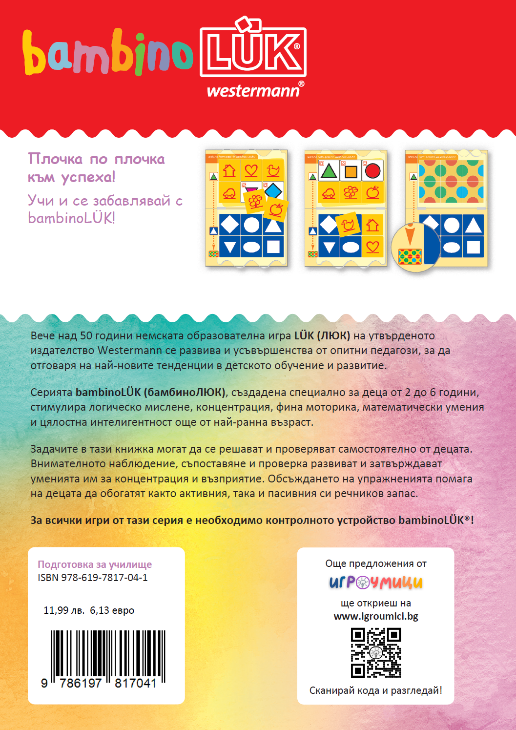 В книжка bambinoLÜK (бамбиноЛюк) "Подготовка за училище" предназначена за деца от 4 до 7 години са събрани 11 забавни игри за концентрация, памет и наблюдателност, които тренират по забавен начин способността на децата за възприемане на информация и развиване на логическо и асоциативно мислене. Те са отлично помагало за подготовка за училище.