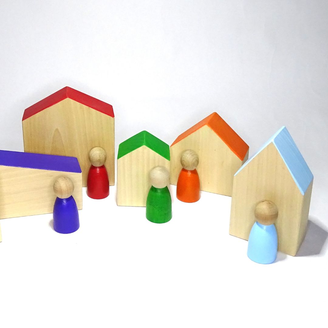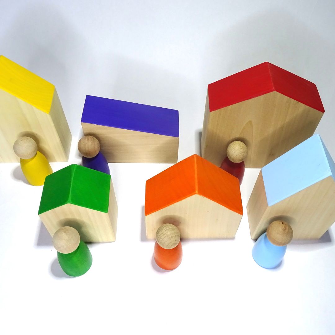 Този материал може да се използва като символична игра, за създаване на истории и малки светове. Детето може да изгради свой собствен град, улица, магазини и много други неща изполвайки собственото си въображение. Къщите и човечетата към тях са боядисани в цветовете на дъгата.