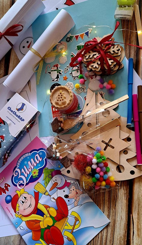 Коледната кутия е направена с много любов и старание, и е с изцяло занимателна и образователна цел, създадена за забавление и игри на децата. Включва дейности, като лепене, оцветяване, изрязване, апликиране, писане, декориране, сладкарство и т.н. Специално подбрани упражнения за развиване на фината моторика, внимание към детайлите, насърчаване на самостоятелна игра, и създаване на празнично настроение. Съдърж цели 11 артили.