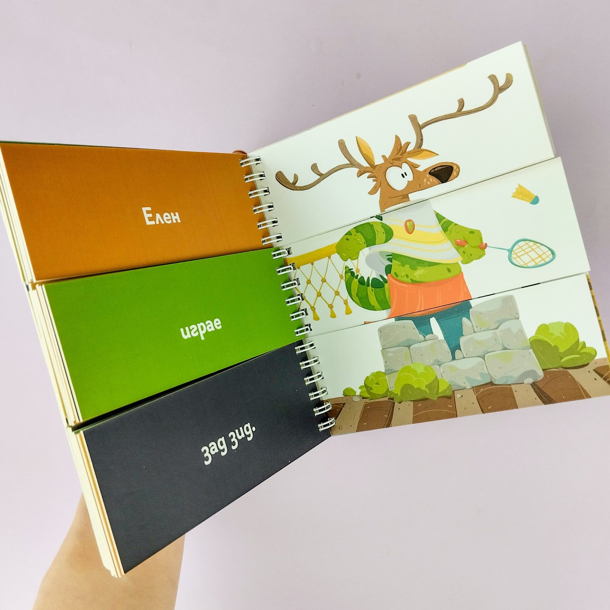 Изработена като книжка - пъзел, всяка страница акцентира на своята буквичка, но и позволява съставянето на най-различни смешни изречения и животни с причудливи тела.